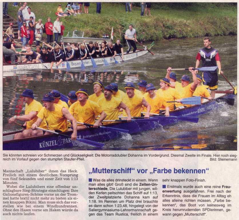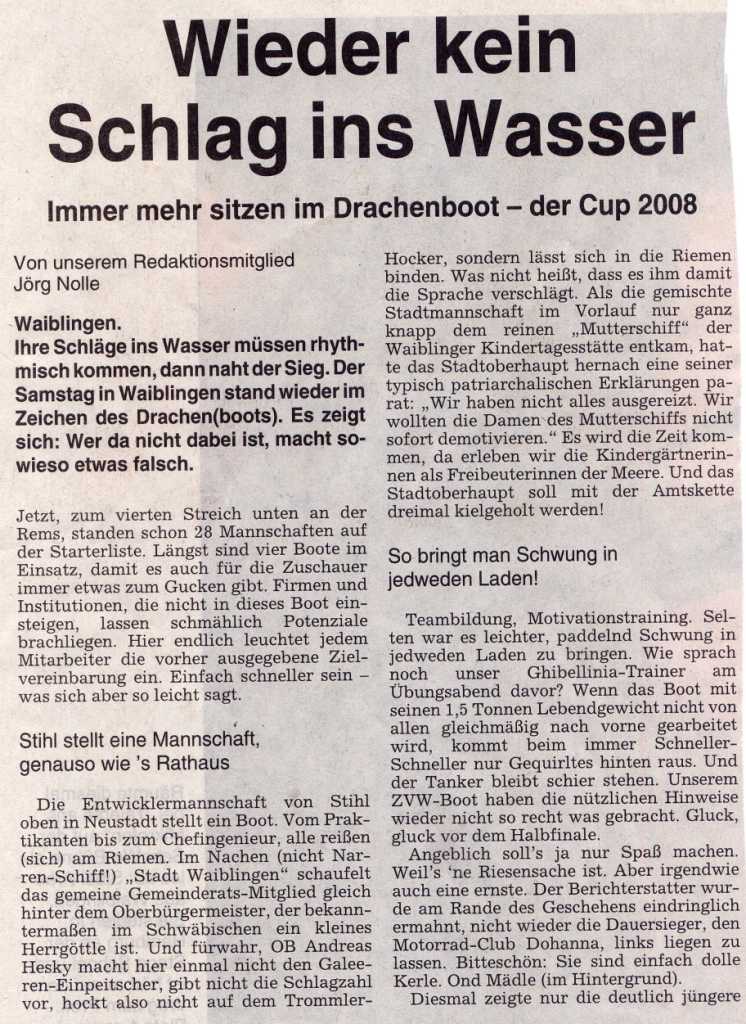 Juli 18, 2008Autoren Infos Am 14. Juli berichtete die Waiblinger Kreiszeitung wie folgt über den Waiblinger Drachenboot Cup Teil 1 Teil 2